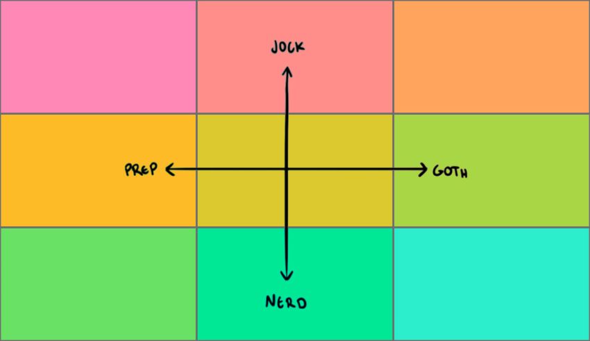 If you lean toward athleticism and sociability and your style is sporty, you’re a jock. If you prefer reading and loneliness and you don’t have a particular style, you’re a nerd. But if you’re into reading and geeky stuff, but you enjoy social activities, and you care about your style, you’re a prep. And if you enjoy things like listening to music, are not sociable, and have a non-conforming style, you’re a goth.